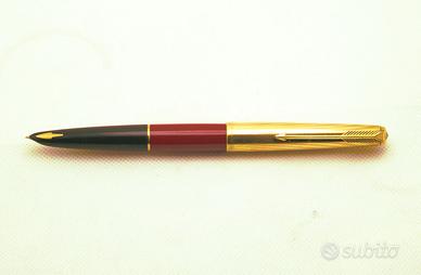 Bellissima Parker 61 con cappuccio laminato oro in vari colori dai riflessi dell'arcobaleno, pennino in oro, fusto color bordeaux, sistema di carica capillare,sistema particolare si deve mettere per qualche secondo in un calamaio con pennino all'in sù.