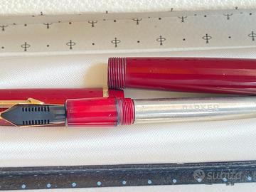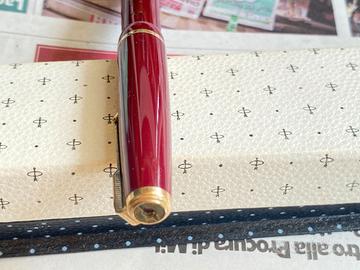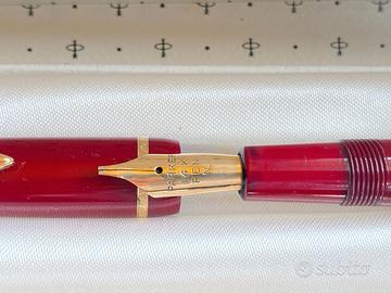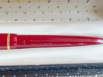 Bellissimo colore Celluloide bordeaux con dettagli placcati oro. Pennino: Parker duofold, oro 14k. Sistema di ricarica: Aeromatico. Accessori: Cartuccia aeromatica. Peccato manchi la punta decorativa del cappuccio,non l'ho trovata