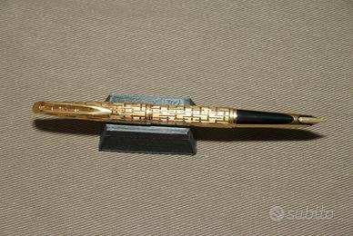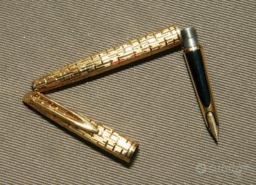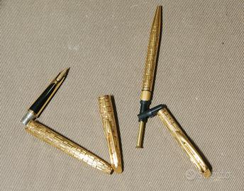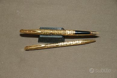 Prestigiosa e rara parure vintage della Waterman cesellata Spessa placcatura d'oro, penne nuove ma purtroppo senza astuccio, solo la biro è stata usata per un poco.. Pennino in oro massiccio 18 Kt.misura credo M. Biro da sostituire refil perchè secco. Non ci sono botte o graffi , condizioni da vetrina. Se siete interessati a penne stilografiche e/o biro date un occiata agli altri miei annunci.