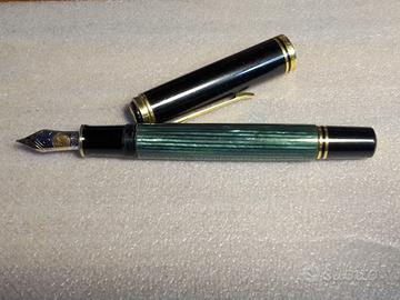 Vendo elegante penna stilografica Pelikan M800 in resina verde/nera striata con finiture dorate, pennino in oro 18k misura F (Fine).