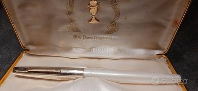 "Universal" composta da propria custodia rigida bianca di interno raso bianco ghiaccio con scritta " Ecce panus Angelorum " ( traduz : ecco il pane de gli Angeli ) e raffigurante un calice con ostia in oro - La penna ha un corpo bianco perlaceo con cappuccio in metallo dorato e propria cartuccia e pennino di origine - articolo di regalo simboleggiante la 1ma comunione cattolica - e' un articolo e kit completo di 2da mano il cui stato di conservazione e' molto buono - fornisco foto specifiche - POST PRESENTE SU ALTRE PIATTAFORME -