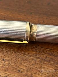 Penna stilografica S.T. Dupont Montparnasse argento-oro, caratterizzata dal motivo godron e dal pennino in oro 18 carati. La parte del pennino (come da foto) si è incastrata nel cappuccio. Praticamente mai usata e perciò all'apertura incastro trovato bloccato