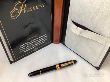 Bellissima penna stilografica SENATOR PRESIDENT nera con particolari dorati. La stilo con pennino bicolore M risale agli anni 80/90 ed è stata conservata con cura e mai usata.