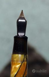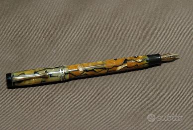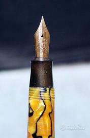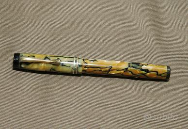Bella penna in celluloide marmorizzata anni '30 modello flat copia della Parker Duofold . Carica a leva laterale, pennino in oro 14 ct Warrented 1° qualità. Penna in ottime condizioni revisionata da riparatore con sostituzione pompetta nuova in silicone. Se siete interessati ad altre penne stilografiche e/o biro date un occhiata agli altri miei annunci.