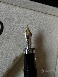 Penna stilografica Visconti Vallecchi 1909 limited edition / edizione limitata, tiratura limitata a 1909 esemplari. Mai inchiostrata, mai utilizzata, uscita dalla scatola per le foto. Realizzata in argento 925 (con laminatura in rodio per evitare ossidazione) e resina nera. L'argento è stato lavorato con la famosa tecnica denominata "cera persa". Pennino in oro 18 kt / 750 bicolore inciso a mano, misura "M". Lunghezza penna chiusa con cappuccio cm 15,5, diametro max (cappuccio) cm 1,7. Dedicata al Futurismo ed in particolare al 1909 anno in cui Filippo Tommaso Marinetti pubblica su Le Figaro il manifesto di fondazione del Futurismo. Nelle forme è ispirata alla produzione artistica di Umberto Boccioni. Scatola a forma di libro, in pelle, contenente la penna numerata 1004 su 1909 esemplari prodotti, libro "La fine del mondo - romanzo di fantascienza futurista" edito ovviamente da Vallecchi e pieghevole con descrizione della penna, uso e manutenzione. Presente controscatola in cartoncino (non in foto) in buone condizioni.