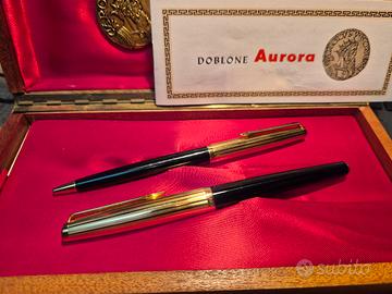 Set Aurora Doblone 1 stilografica e 1 sfera placcate oro 22k con pennino oro massiccio 14k scatola in legno originale con due dobloni di Carlo V e garanzia del 1969 tutto originale 100%