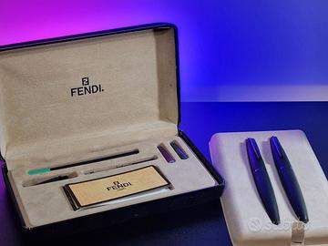 Cofanetto FENDI -vintage- da collezione (mai usato) con: Penna Stilografica nera in METALLO soft touch Penna a sfera nera in METALLO soft touch Set completo originale Il set comprende: Cartuccia a pompa d'inchiostro, ricambio punta per conversione penna STilografica/sfera, cartuccia penna asfera, 2 cartucce inchiostro, libretto e garazia Prezzo non trattabile Per altre info o foto contattare Per ritiro a mano zona Metro Jonio/Monte Cervialto