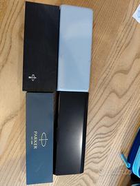 Lotto di penne di marche diverse. - Penna Aurora in astuccio blu. - Penna Osma in astuccio nero. - Due penne Parker, una in astuccio bianco e una in astuccio grigio. Nella penna paeker è Osama da cambiare il refel