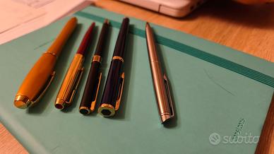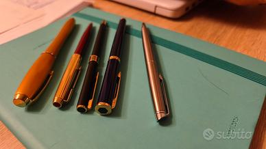 Vendo 5 penne come da descrizione in ottime condizioni e perfettamente funzionanti. - Waterman Hemisphere, acciao satinato, a sfera, anni 2000, condizioni perfette - Waterman Preface, laccata blu/placata oro, rollerball, anni '90, condizioni perfette - Aurora Marco Polo, nero opaco/oro, a sfera, anni '90, condizioni perfette - Parker 75 Custom Laque, placata rossa/placata oro, a sfera, anni '90, condizioni perfette - Parker Urban 125 th, colore Mandarin, stilografica, anni 2000 (leggeri segni sul cappuccio) Vendita preferibilmente in blocco.
