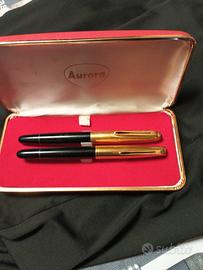 penne stilografiche anni 70 marca Aurora con pennino in oro e cappuccio placcato oro. In ottime condizioni. Confezione originale con due pezzi