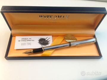 Vendo stilografica marca Waterman originale nuova, mai usata né caricata, modello IDEAL, in argento placcato, comprensiva di prestigioso cofanetto originale. Pennino oro 18 Kt. Comprese nel prezzo vendo antica penna a sfera dorata, marca "Watermans" originale, un'altra vecchia stilografica Waterman e un'antica stilografica non marcata. Vendo tutto il lotto di 4 penne insieme
