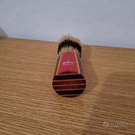 Pennello da barba "vintage" da collezione, marca Omega (made in Italy) in pura setola di cinghiale o tasso, con manico in legno, design a strisce verticali di colori rosso/giallo/blu e ghiera in metallo con lievi segni di ossidazione. Articolo acquistato a metà degli anni '90 (era in un cofanetto insieme ad una lametta abbinata : usata solo quest'ultima).