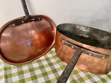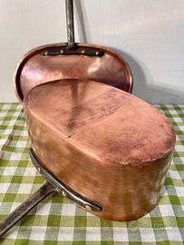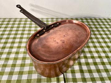 Vendo pentola vintage ovale in rame con coperchio e manico lungo.