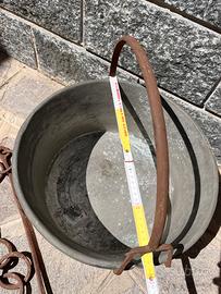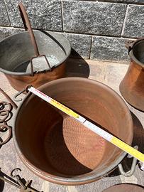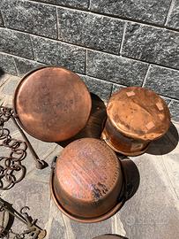 Tre pentole in rame , bilancia romana in ferro vintage,bilancino e catena per camino per appendere le pentole.Vendo in blocco se possibile Possibile ritiro a mano su Bergamo o Milano