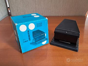 Perforatore Zenith modello 787 con la sua confezione originale. classico articolo di cancelleria "Made in Italy". Può forare con precisione fino a 15 fogli di carta contemporaneamente. Realizza due fori che possono essere posizionati a una distanza di 70 mm o 80 mm. È realizzato interamente in metallo, con punzoni in acciaio trafilato per garantire robustezza e durata nel tempo. Dispone di una base in gomma che svolge una doppia funzione, è antiscivolo per garantire stabilità durante l'uso ed è antigraffio per proteggere la superficie della scrivania. Inoltre, funge da contenitore per la raccolta dei ritagli di carta.