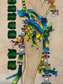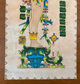Pergamena arte messicana su pelle scamosciata con motivo che cattura un momento cruciale della mitologia e della storia regale Maya, legata ai cicli di vita, morte e rinnovamento, e al lignaggio divino dei loro sovrani.