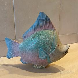 Bel pesce decorativo da appoggio, in legno intagliato e dipinto a mano con bei colori vivaci, tipico artigianato thailandese di fine anni ’80. Presenta una riparazione della pinna superiore. Dimensioni: cm 16x 14 h x 5 cm nel punto max della pancia