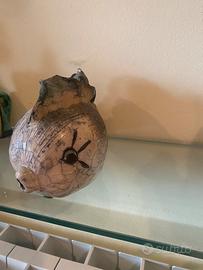 Pesce palla in ceramica realizzato con tecnica Raku ; pezzo unico fatto a mano , riflessi metallici .