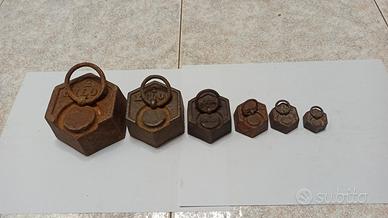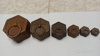 Serie di pesi antichi in ghisa per bilancia : uno da 2 kg, , uno da 1 kg, 1 da 500 grammi, 1 da 200 grammi, 1 da 100 grammi e uno da 50 grammi. Sono in ottime condizioni per l'eta', posso anche provvedere alla pulizia se lo preferite. Prezzo leggermente trattabile visto cge sono oggetto da collezione abbastanza difficili da reperire.
