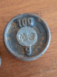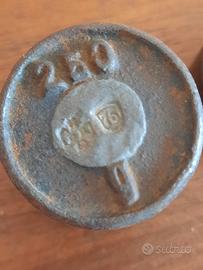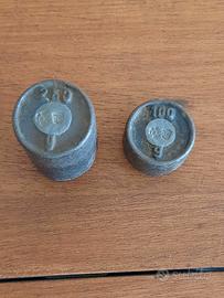 Coppia di pesi in metallo, ideali per bilance ma più probabilmente come elementi ornamentali e di arredo per locations. In ottime condizioni - Peso da 250 grammi e 100 grammi. - Materiale: metallo - Forma cilindrica