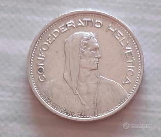 Vendo moneta da 5 Franchi Svizzeri del 1951 B (marchio di zecca di Berna), coniata in Argento .835. Questi pezzi sono stati ritirati dalla circolazione nel 1968 e sono molto ricercati per il loro valore storico e intrinseco del metallo prezioso.