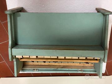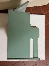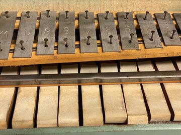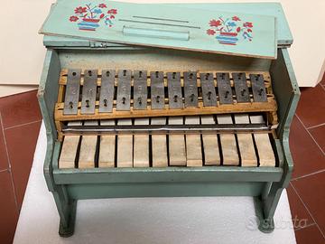Gioco musicale in legno primo pianoforte per bimbi, vintage per imparare la musica; risale sicuramente agli anni cinquanta del secolo scorso; i tasti battono contro elementi musicali tipo xilofono; più che altro da collezione in quanto i alcuni tasti non riproducono la nota esattamente, completo in ogni sua parte, avrebbe bisogno di un piccolo restauro; bello, decorato con vernice integra, segni del tempo (vedi foto) da collezione. Misure cm 28 x 22 x 15