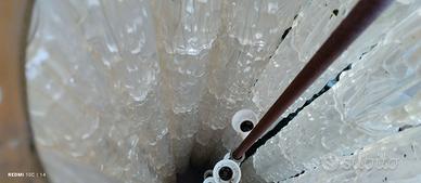 Piantana Antica anno 1950/60 Base in legno di Noce o Ciliegio, perché nonostante presenti un colore scuro tipico del legno di noce, si riscontrano sfumature leggermente rossastre, con piedini da circa 10 cm e legno della base intagliato a mano della stessa altezza. Porta lume interno che corre per tutta l' altezza di circa 1,5 MT e aste singole intere per ogni fila di bicchieri. I Bicchieri sono perfette riproduzioni di vetro di Murano, spesso circa 1 cm, con spettacolare effetto diamante quando la luce la attraversa. In ottime condizioni con alcuni difetti non visibili dall' esterno che possono essere restaurati facilmente. Lo stesso articolo, nonostante varie ricerche, risulta introvabile in questa versione in legno. Si può presupporre al momento che si tratti di un pezzo unico o cmq molto raro. Disponibili riproduzioni vintage on line al costo di oltre 5000 € Se acquistata nella condizione attuale, prezzo affare da non lasciarsi scappare. Completamente smontabile da un esperto per un restauro minuzioso. È possibile accordarsi sulla spedizione e nell' includere i costi nel prezzo dell' articolo. Contattare per info.