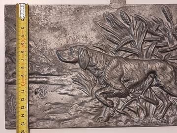 Coppia di piastre in ferro con bassorilievi raffiguranti cani da caccia dimensioni: 15.5 x 29 Cm