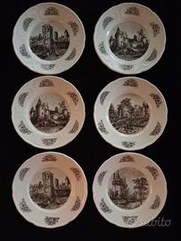 Lotto di 6 piattini da frutta o dessert + 2 piatti piani antichi rappresentanti famosi castelli francesi. Alcuni piatti hanno qualche piccola sbeccatura sul bordo dovuta all’uso e al tempo. Stato di conservazione generale più che buono. Diametro piattini cm 20; diametro piatti piani cm 24.