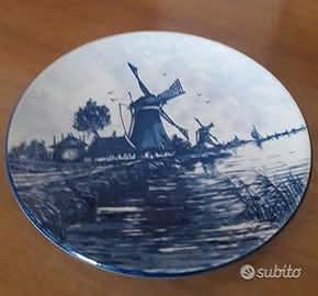 - particolare PIATTO ARTISTICO vintage anni 50, pitturato a mano MULINO A VENTO SU CANALE