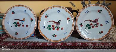 3 bellissimi piattini antichi di ceramica umbra Deruta? Dipinti a mano.Diametro cm 19 in alcuni punti sono leggermente spizzati( vedi foto)