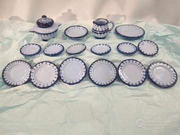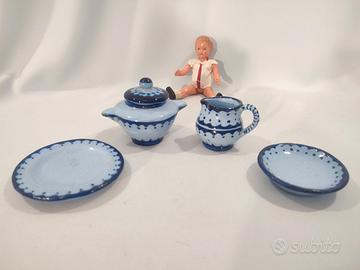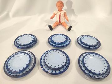 Giocattolo d’epoca, servizio artigianale di piatti per bambole ditta F.A.M.A. Ascoli Piceno - Made in Italy anni 50, in ceramica dipinto a mano, in ottimo stato con leggere usure dovute al tempo. Il servizio si compone: 6 piatti piani grandi (diametro cm. 6,5 circa); 6 piatti piani piccoli (diametro cm. 5 circa); 1 zuppiera (alta cm. 7 circa); 1 brocca (alta cm. 5 circa); 1 piatto piano grande da portata (diametro cm. 8,5 circa); 1 piatto cupo grande da portata (diametro cm. 7 circa); LA BAMBOLINA NON E' COMPRESA NELLA VENDITA!! È davvero molto carino e particolare!!! GUARDATE LE FOTO PER UNA MIGLIORE DESCRIZIONE. Posso consegnare ad Ancona e limitrofi, concordando con massima serietà oppure spedire in tutta Italia con pacco tracciabile