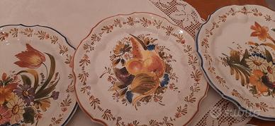 Vendo otto piatti decorativi in ceramica,vecchia Bassano,dipinti a mano: quattro grandi( diametro cm 31) e quattro piccoli( diametro cm 24) bordo smerlato blu e terracotta,motivi frutta e fiori.Leggere scalfiture dovute al tempo su uno grande