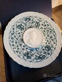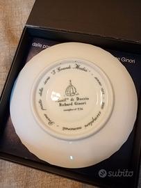 Piatti decorativi in porcellana "I Grandi Medici", della manifattura Richard Ginori, prodotti in tiratura limitata (2000 pezzi). Ciascun piatto, contenuto nella confezione originale, con il suo libretto e in perfette condizioni, presenta cavetto decorato da medaglione in biscuit bianco raffigurante il profilo di un membro della famiglia e tesa a motivi floreali in monocromia blu. Dimensione di ciascun piatto: circa cm 20,5