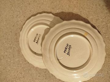 Vendo piatti in ceramica vintage con bordo smerlato e decorazioni floreali dipinte a mano, di manifattura italiana Bassano, risalenti alla metà del XX secolo.