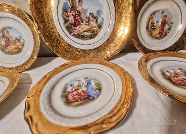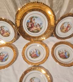 Numero 6 piatti ed un piatto più grande da portata Hardek Bavaria, decorati con motivi bucolici ed impreziositi dal bordo in oro zecchino. Manifattura pregiata Hardek. Dimensioni 17 cm i piatti più piccoli. Dimensioni 23 cm il piatto da portata