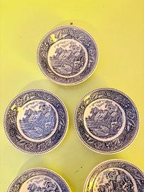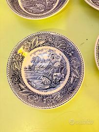 Vendo set di piattini in pregiato ironstone inglese prodotti dalla storica manifattura Wood & Sons di Burslem. Il decoro "Woodland" cattura l'essenza della campagna britannica attraverso la raffinata tecnica del transferware blu, mostrando un suggestivo paesaggio pastorale con cottage e bestiame. Sono piattini d'epoca, marchiati per celebrare il bicentenario della dinastia dei maestri vasai Wood, presentano una naturale cavillatura del tempo che ne autentica il fascino vintage. Ideali per collezionisti o per donare un tocco di eleganza rétro alla tavola e alla casa. 13,5x3 cm