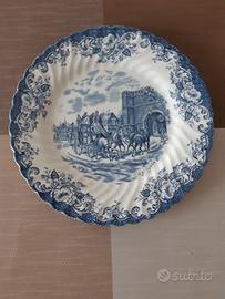 Coppia di piatti piani da esposizione di porcellana in perfette condizioni, come da foto. Di marca Johnson Brother'S, sono raffigurate due diverse scene Old-England nell’interno dei piatti. Misura diametro 25 cm.