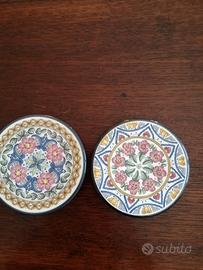 Sono sette piattini di ceramica marcati MG Ceramicas Spain, diametro cm. 10. Sono tutti diversi e decorati con vivaci e coloratissimi motivi geometrici. Sul retro, oltre al marchio è presente un foro di passaggio per appenderli. La superficie decorata è perfettamente orizzontale quindi possono essere utilizzati come sottobicchieri.