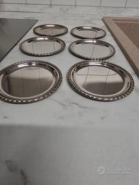 Sei fantastici piattini sottobicchiere in argento 800. Peso 21 grammi cadauno. Prezzo 40€ l'uno o 200€ di tutti e sei