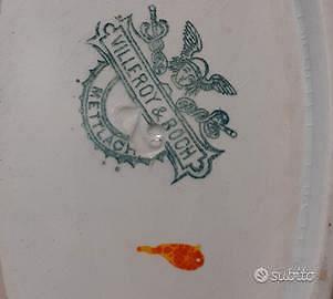 Piattino ciotola Villeroy & Boch. Ceramica bianca e bordo rosso arancio. Motivo classicheggiante in rilievo. Lunghezza cm. 25. In ottime condizioni, solo alcuni punti del bordo lievemente sbiaditi come da foto.