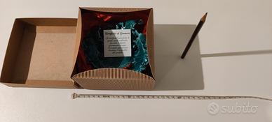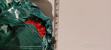 Questo piattino artigianale in ceramica ha la forma di una foglia di vite ed è smaltato di un bel verde lucente. Prodotto a Napoli, nel laboratorio di ceramica contemporanea di Sonia Di Marz , l’oggetto è nuovo con garanzia, è contenuto nella sua confezione originale e non è mai stato usato o esposto. E’ largo 15 cm, profondo 14 e alto 5. Pesa 128 g. 13