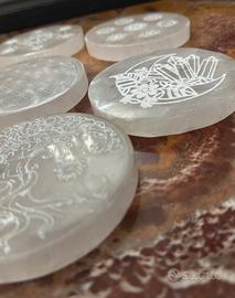 Il prezzo è per singolo pezzo Un piattino in selenite serve principalmente per la purificazione e ricarica energetica di altri cristalli e oggetti personali, grazie alla sua alta vibrazione, e per armonizzare l'energia dell'ambiente portando chiarezza mentale, pace e protezione, ma è molto delicato e non va mai bagnato. Proprietà principali del piattino in selenite: Purificazione e ricarica: È uno strumento eccellente per "pulire" l'aura, rimuovere blocchi energetici e ricaricare altri cristalli semplicemente posizionandoli sopra per alcune ore o durante la notte. Chiarezza mentale e spirituale: Favorisce la chiarezza del pensiero, la pace interiore e connette con la luce divina, risvegliando sensazioni elevate. Armonizzazione ambientale: Posizionato in casa, purifica l'energia e protegge lo spazio, creando un ambiente più sereno e positivo. Connessione con l'energia femminile: Essendo collegata alla dea della luna, è ritenuta legata alla fertilità, sensualità e al sistema riproduttivo femminile.