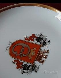 La decorazione al centro del piattino, integra in tutte le sue parti, presenta all'interno di uno scudo araldico una grande "E" color argento, sormontata da una corona in oro zecchino con tre piccoli puntini chiari in rilievo, il tutto in campo arancione.
