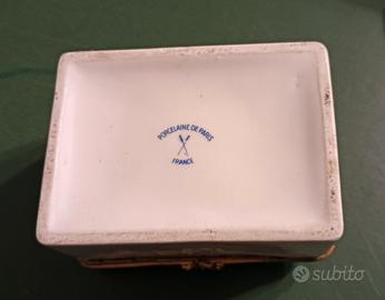 Scatolina in porcellana francese raffigurante sul coperchio e all'interno una nave "Triremeromaine de la mediterranee", Porcelaine de Paris France. Cm 9x7x5