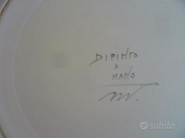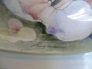 Vendo grande piatto in ceramica decorato a mano, a tema floreale, dall'artista trevigiana Mary Vardanega, la sua pittura esprime tenerezza e mistero della terra veneta, vintage, il diametro misura cm. 40 e l'altezza cm. 9, in buone condizioni di conservazione, nessuna sbeccatura.