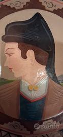 Splendido piatto decorativo in ceramica (terracotta smaltata) di manifattura artigianale sarda, risalente alla metà del XX secolo. L’opera è un eccellente esempio di artigianato artistico regionale, caratterizzato da un’estetica "arcaica" e modernista. Raffinato ritratto di profilo maschile con copricapo tradizionale, immerso in un paesaggio stilizzato con la presenza di un Nuraghe, simbolo iconico della Sardegna. Cornice decorativa ricca di dettagli graffiti a mano che ritraggono cavalieri, alberi della vita e motivi geometrici, tipici della simbologia sarda. Ceramica graffita e dipinta a mano con finitura opaca e cromie naturali (terra di Siena, bruno, verde pastello). Il retro presenta numerazione di serie (1200/200) e fori passanti con cordino originale per l'esposizione a parete. Ottime condizioni vintage. Presenta lievi e normali segni del tempo sulla smaltatura che ne attestano l'autenticità e l'epoca (come da foto).
