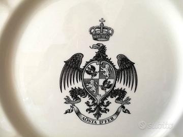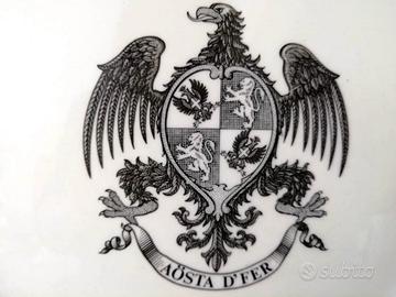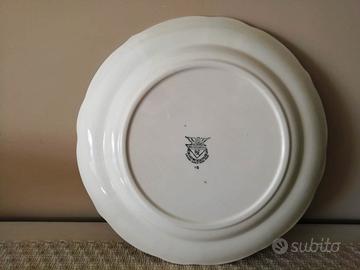 Piatto bianco in diamondstone realizzato dalla Richard Ginori. Al centro lo stemma e il motto del 6º Reggimento Lancieri di Aosta "AOSTA D'FER". Presenta un diametro di circa 26 cm e è in perfetto stato di conservazione. Tesa ondulata e scannellata.