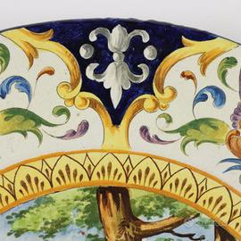 Piatto da parata in ceramica smaltata di gusto neorinascimentale. Sulla tesa