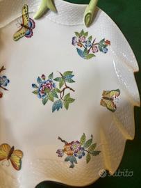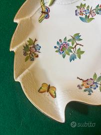 Piatto da portata o vassoio a forma di foglia dí porcellana Herend,caratterizzato dal motivo Queen Victoria. Il motivo raffigura farfalle e fiori dipinti a mano.